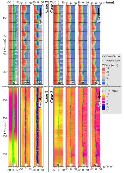 Figure 6 shows the plan views of the bed topography for both cases, the sediment deposition patterns, and the bedrock surface erosion. The WS represents the bed surface with the sediment (Figure 6a–g), whereas NS indicates the bed surface after removing the sediment coverage. (Figure 6h–n) The timesteps 1, 4, and 6 are displayed to show the temporal evolution of the bed configurations. Timestep 8 of Case 2 is also presented here, indicating the result after slowing the rotation speed to 40 RPM (Figure 6g for WS and Figure 6h for NS). The plan view over the whole series of timesteps can be found in Appendix B and Appendix C (Figure A2, Figure A3, Figure A4 and Figure A5).