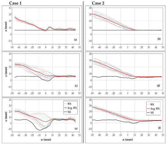Transverse profile sections—Case 1 (left) and Case 2 (right). The horizontal and vertical axes represent the radial and vertical coordinates, respectively. The average of the bedrock surface profiles (NS, black color), the 18 profiles of the sediment coverage (WS, gray color), and their average (Avg. WS, red color) are indicated from top to bottom, at timesteps 1 (T = 0 h), 4 (T = 6 h), and 6 (T = 48 h) (a,c,e) for Case 1, and (b,d,f) for Case 2).