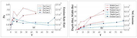 (a) Graphs of the mean erosion rate (Em, dashed lines, mm3/h) and the fraction of exposed bed (Po, solid line) for Case 1 (in red) and Case 2 (in blue). The horizontal axis is the cumulative time T (h); the vertical axes represent Po on the left and Em on the right; (b) Temporal evolution of the erosion for Case 1 (red) and Case 2 (blue) over cumulative time T (h). The vertical axis on the left represents the depth (He) and the width (Be) of the inner channel (mm), and the right axis represents the volume of erosion (mm3/h).