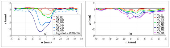 Transverse profile sections obtained for each timestep, Case 2 (48 RPM): (a) timestep 1 (T = 5 min), (b) timestep 2 (T = 3 h), (c) timestep 3 (T = 6 h), (d) timestep 4 (T = 12 h), (e) timestep 5 (T = 24 h), (f) timestep 6 (T = 48 h), and (g) timestep 7 (T = 72 h); (h) timestep 8 (T = 84 h) but with 40 RPM.
