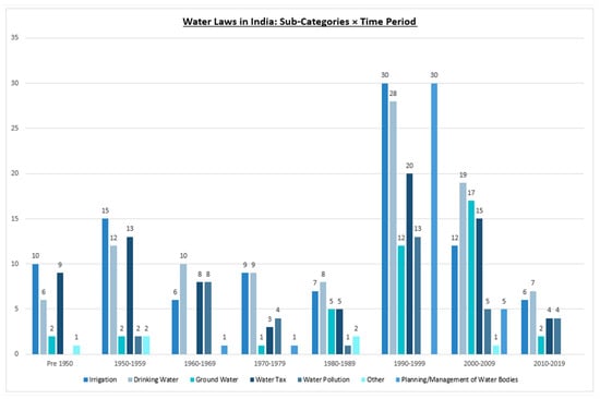 Figure 3 shows a timeline distribution of laws. In line with the discussion above, we find that nearly half of the 22 colonial laws pertained to irrigation. These laws only impose an obligation on the state to compensate for the loss of drinking water due to the construction of irrigation works. The remaining half of the laws correspond to water taxes. Irrigation laws continued to dominate legislation on water in the first two decades post-independence and received another fillip in the post-liberalisation era in the 1990s.