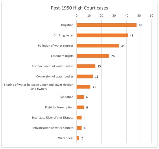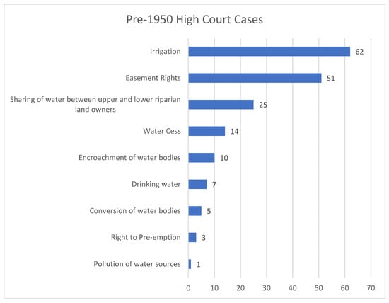 There exist several qualitative studies of judicial decisions rendered by the Supreme Court and High Courts on the right to water in India. These include reviews by Philippe Cullet [60] and Vrinda Narain [61]. However, a comprehensive qualitative and quantitative study of all Supreme Court and High Court cases on the “right to water” has not been conducted thus far. The “right to water” dataset created at the Land Rights Initiative included 59 Supreme Court and 189 High Court decisions. As mentioned above, all the Supreme Court decisions were rendered post the adoption of the Constitution and the creation of the Supreme Court in 1950. However, since many High Courts predate the adoption of the Constitution and creation of the Supreme Court, 79 High Court decisions were rendered prior to 1950 and 110 decisions were rendered post-1950. It may be noted that this dataset excludes cases decided by lower courts, such as civil and criminal courts, and tribunals such as the interstate river disputes tribunals and the national green tribunals.