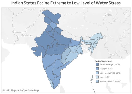 - IndiaSpend. Indian States Facing Extreme to Low Level of Water Stress Desk. Available online: https://public.tableau.com/app/profile/farah.thakur/viz/IndianStatesFacingExtremetoLowLevelofWaterStress_Desk/Dashboard1 (accessed on 8 November 2021).
