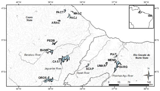 Location of the 13 study lakes (Table 1) in the Brazilian semiarid region (Ceará and Rio Grande do Norte states).