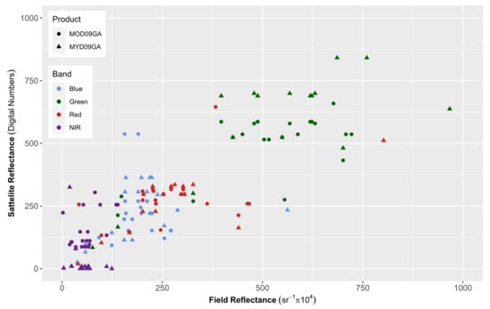 Reflectance that was extracted from subsets of MODIS products MOD09GA and MYD09GA compared to the reflectance that was measured in the field at the same day (78 images, r2 = 0.67). The field reflectance data was collected with hyperspectral radiometers and used to simulate the MODIS bands 1 (red), 2 (near infrared), 3 (blue), and 4 (green).