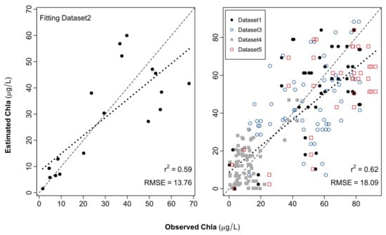 The selected model (#1, Table 4) for chlorophyll-a (chla) estimation from the MODIS images. The model was fitted with field reflectance data and chla data from Dataset 2 and validated with the remaining datasets and with reflectance data from the MODIS images of the same day of the chla data. The dashed lines illustrate the 1:1 ratio and the dotted ones are the line of best fit.