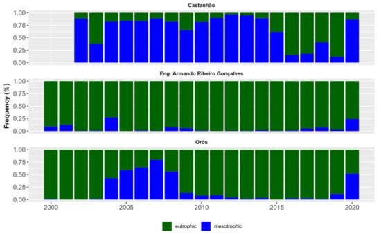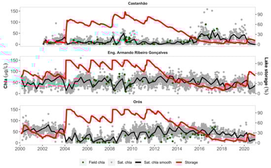 A quick look at the produced time series shows that the three lakes exhibit quite distinct trophic state histories. Eng. Armando Ribeiro Gonçalves (EARG) is almost all the time under eutrophic conditions, Castanhão was mostly mesotrophic until 2015, and Orós had prevalent mesotrophic conditions in 2005–2008 and 2020 but was eutrophic most of the time. As shown in Figure 6, EARG did not have water renewal rates as high as the other two, which is a possible explanation for the resilience of its eutrophic state. However, a more attentive look at both the chla and lake storage time series reveals interesting common patterns. A steep rise in water level is often accompanied by an abrupt descent in chla, as dramatically seen in 2004, a very rainy year in which man-made lakes across the region overflowed. The decline in chla was probably a joint effect of biomass dilution by the inflowing water, biomass loss in the outflowing water, and light attenuation by suspended solids whose concentration increases during rainy events [,,,,,,,]. Although less dramatic, the same pattern can be seen in the rainy seasons of 2006–2011. Another pattern is the tendency of chla rising and keeping high during dry periods. That was especially evident during the multiannual drought that began in 2012, which appeared to favor a stable maintenance of high chla values until the rainy season of 2020. Similar temporal dynamics were observed in a 16-year study in the North Pine Dam [], an Australian man-made semiarid lake with high interannual variability in the hydraulic regime.