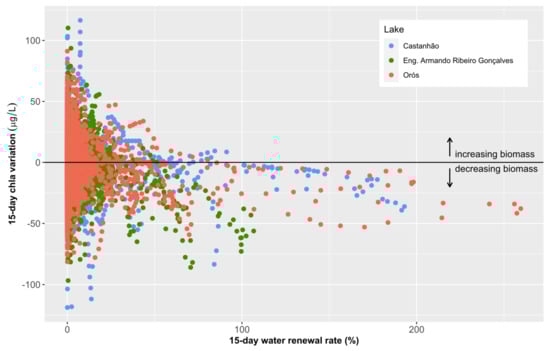 Chlorophyll a (chla) variation in 15-day periods as a function of the water renewal rate, calculated as the total water inflow divided by the median stored volume in the same periods.