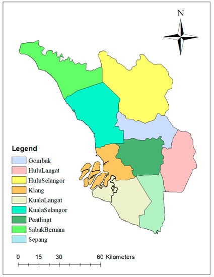 The study area considered for this study was the state of Selangor, Malaysia. Selangor is Malaysia’s most developed and densely inhabited state. The state of Selangor is divided into nine districts, as shown in Figure 1. Selangor is located on the western cost of Malaysia. The state is surrounded by the state of Perak to the north, state of Negeri Sembilan to its south, and the state of Pahang to its east. The study area was located between the latitudes ranging from 2°35′ to 3°60′ N and longitudes ranging from 100°45′ to 102°00′ E. The total area of Selangor is 8100 Km2 with the population of over 6.5 million. The temperature in Selangor ranges between 23 to 30 °C, with an annual mean temperature of 26 °C. Selangor experiences sunny days throughout most of the year, with sporadic rainfall. The annual rainfall in Selangor is 1200 mm, and humidity reaches more than 80% [46]. Kuala Lumpur, the capital of the country, and the federal administrative capital, Putrajaya, are located within the state of Selangor and were considered in the study area. Of all Malaysian states, Selangor has the greatest population density and gross domestic output per capita. Selangor is geographically diverse, having major metropolitan centers, agricultural development, forests, and wetlands, as well as a wide range of land use and related environmental aspects [47].