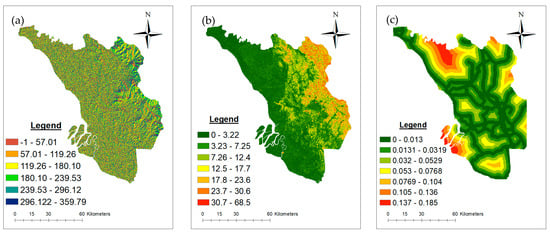 Spatial parameter map of Selangor, Malaysia. (a) Aspect, (b) slope, (c) distance from road.