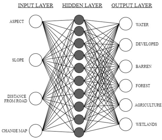 Simulation modules were used to minimize the dynamics of composite urban structures and interpret them in a clear and accessible manner. Studies claim that the CA-ANN method is more effective than linear regression, thus the modules for the land-use change simulation (MOULSCE) plugin were implemented for transition potential modelling and future simulation [54,55]. The MOLUSCE plugin is perfectly adapted to evaluating spatiotemporal land-use changes, transition potential modelling, and predicting future scenarios [54]. The artificial neural network (ANN) was used in association with cellular automata (CA) to predict the land use changes. Because of its dynamic simulation capacity, high efficiency with limited data, simple calibration, and ability to reproduce different land covers and complicated patterns, CA-ANN was chosen to simulate land use change. CA-ANN combines the CA and Markov chain to model land use changes across various categories [56]. ANN was employed in the transition potential modelling to establish trends on the basis of which future prediction will be made. The MOLUSCE plugin within QGIS was executed to establish the spatiotemporal changes with a given time period and calculate the LULC transition to generate the LULC change map. A transition potential matrix was generated in the study between (2001–2011) to create the change map. The ANN-multilayer perception method (ANN-MLP) was employed for the transition potential modelling. Slope, aspect, elevation, and distance from the road were the spatial parameters implemented as input parameters. The structure of ANN-MLP is shown in Figure 4, where the input layer is processed by the hidden layers and produces the output layer containing the reclassified LULC classes. The transition potential model is trained based on the LULC maps of 2001 and 2011, as well as spatial parameters to produce the predicted map of 2021.