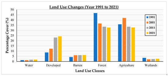The classified LULC maps of the study area for 1991 to 2021 were classified into six different land use classes, namely (i) water, (ii) developed, (iii) barren, (iv) forest, (v) agriculture, and (vi) wetlands. LULC changes were observed over the period of 3 decades, ranging from 1991 to 2001, 2001 to 2011, and 2011 to 2021. Agricultural, forest, and developed areas were found to be the major land use types that cover Selangor, Malaysia, as shown in Figure 6.