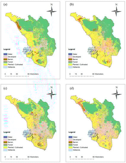 LULC classification maps of Selangor for (a) 1991, (b) 2001, (c) 2011, and (d) 2021.