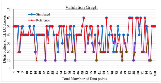 The transition potential model (ANN) was validated by comparing the classified land use map of 2021 with the resulting simulated map of 2021 from the CA-ANN simulation [57,64]. The comparison of the maps was evaluated based on the kappa coefficient value and percentage of correctness. The magnitude of correlation between the classified map and simulated map of 2021 is represented in the validation graph shown in Figure 8. The graph illustrates the degree of agreement between the different land use classes from the two maps. The land use classes in perfect agreement overlap each other, indicating that the land use pattern was simulated correctly, whereas deviance from the classified line denotes an inaccurate simulation of the land use pattern. The percentage of correctness for the simulation was 82.43%, and 0.72, 0.92, and 0.76 were the overall kappa, kappa histogram, and kappa location, respectively [57]. Based in the validated model, the CA-ANN simulation was executed to obtain the predicted land use maps of the years 2031, 2041, and 2051.