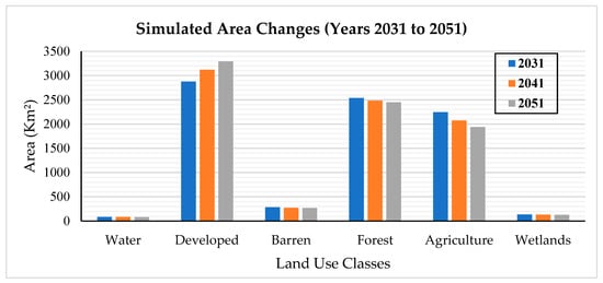 The CA-ANN simulation was performed to obtain the predicted LULC maps from the years 2031 to 2051. Figure 9 shows the predicted changes in different LULC classes from the years 2031 to 2051 in Selangor. Total area cover by different LULC classes and the percentage of cover for the years 2031, 2041, and 2051 are illustrated in Table 5. The observed outcomes elucidated the steady changes within the study period. A continued growth was noted in the developed land use pattern, where the area increased from 2874.31 Km2 (35.23%) in 2031 to 3118.96 Km2 (38.23%) in 2041, then to 3292.40 Km2 (40.36%) in the year 2051. Due to the increasing rate of area covered by developed land, diminishing trends for forest and agricultural lands were observed in the simulated maps. Forest cover experiences a decline from 2536.46 Km2 (31.09%) in 2031 to 2447.83 Km2 (30.01%) in 2051. Similarly, agricultural cover also maintains its decreasing trend between the years 2031 and 2051 as the total percentage cover regresses from 27.51% to 23.78%, respectively. Water, barren, and wetlands experience a very minute change in their total area covered over the study period, as shown in Table 5. Water cover reduced slightly as the areas decreased from 85.14 Km2 in 2031 to 81.80 Km2 in 2051. Similarly, barren lands reduced from 284.25 Km2 in 2031 to 266.75 Km2 in 2051. Wetlands showed a drop in the percentage of area cover, reducing from 1.64% in 2031 to 1.58% in 2051.