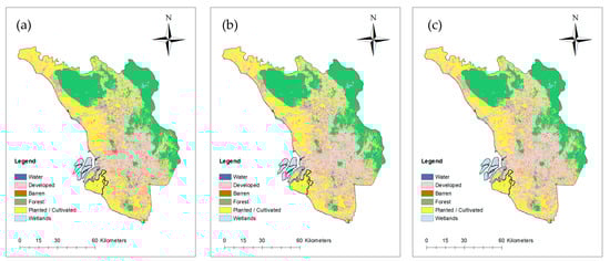 Simulated LULC maps of Selangor for: (a) 2031, (b) 2041, and (c) 2051.