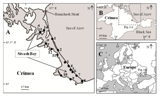Bay Sivash with the distribution of sampling sites (A—the local scale, B—the Crimean scale, C—the European scale).