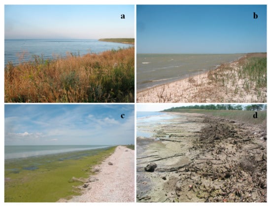 The views of Bay Sivash: (a,b)—general views; (c)—green algae Cladophora mats; (d)—belts of the common reed (Phragmites australis) which have died due to the salinity increase.