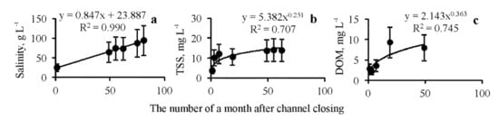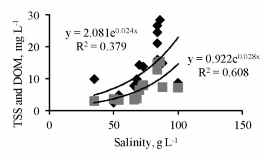 The use of new and published data [12,18,19,20] showed that since the closure of the North Crimean Canal, salinity, TSS, and DOM increased in Bay Sivash (Figure 7). As was shown before, the content of TSS positively correlates with salinity in different water bodies of Crimea [12,22] and different regions [23,24,25,26,27]. There are different reasons for the observed correlation of increases in salinity, TSS, and DOM, and the main one in Bay Sivash may be a positive correlation between liquid density with salinity that resulted in a lower sedimentation rate of single-sized particles [12]. Additionally, the disappearance of reed beds may be responsible for increasing the mineral particle flow into the bay [12]. Dramatically decreased reed beds of P. australis do not prevent erosion of small clay cliffs on the western coast of the lagoon now. Currently, muddy water stains near those cliffs have been observed regularly [4]. Accelerated cliff erosion may also contribute to the TSS increase in the Bay Sivash. The increase in DOM concentration can probably be explained by the TSS increase and/or the addition to primary production due to the development of floating mats of filamentous green algae Cladophora [4,12,19]. The intensive development of Cladophora in hypersaline water bodies can increase their primary production by more than 10 times [3,28]. In November 2018, the abundance of benthic microalgae related positively to an increase in salinity and TSS [19]. Another reason for an increase in DOM is the increased release of exopolymers by algae into the water. Under increased salinity, a larger amount of primary production is excreted into the environment as exo-metabolites [29,30,31,32].