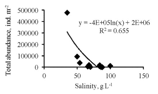 Between September and December 2020, the total number of zooplankton decreased by 4 times, which was probably due to winter conditions. If the mid-winter point (December 2020) is excluded, then a significant relationship is revealed between the total abundance of zooplankton and salinity (R = 0.893, p = 0.005), as follows: