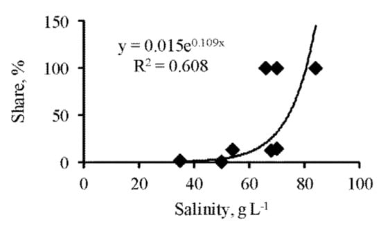 The decrease in the number of taxa of different levels with an increase in salinity above 50 g L−1 is a well-known phenomenon, and the dependence at the global level has been quantitatively characterized [39]. Using the data of that article, the authors calculated the following equation (R = 0.987, p = 0.001):
