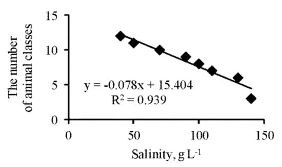 Calculated Equations (9) and (10) showed that, despite a much larger number of classes at all salinities at the global level, the general trend is the same in both cases. In the case of Bay Sivash, the number of classes decreased with an increase in salinity from 50 to 150 g L−1 by 3.6 times, and at the global level, with the same rise in salinity, the number of animal classes decreases 1.5 times.