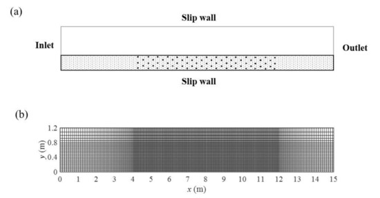 The simulated channel is three-dimensional flat domain and has 15 m length and 1.2 m width as Figure 1a, which is similar to the laboratory setting of White and Nepf [11,12]. The stream-wise, lateral, and vertical coordinates and velocities are , and , respectively. The vegetated area is constructed with about 2400 cylinders of diameter and 0.4 m height, which are distributed over one side of the channel. It consists of lots of rigid cylinders and they are spaced 6 and 4 cm apart from each other in x, y directions, respectively. Also, these cylinders are treated as impermeable wall, so they have no-slip condition and zero-gradient condition for velocity pressure boundary condition, respectively. These cylinders are distributed over one side of the channel. To be specific, the array of circular cylinders extends from x = 4 m to 12 m in stream-wise direction and from 0 m to 0.4 m width in lateral direction. This vegetated area condition corresponds to the case which has the volume fraction 0.045 in White and Nepf [12]. In other words, in the present setups for the numerical experiments, the ratio of the bottom area to the cylinder surface area is set to . To acquire highly reliable results even inside of the vegetated area, the calculations are performed on grids consisting of up to 27 million cells. The range of grid sizes is 4 mm to 1.25 cm in x and y directions and 4 cm in z direction. Figure 1b illustrates the computational domain on the x-y plain which is reduced by 10 times smaller than real scale. As in Figure 1b, the mesh is much finer near the array of the cylinders than other areas. The grid sizes near the cylinders are 4 mm, 4 mm, 4 cm in x, y, z directions, respectively.