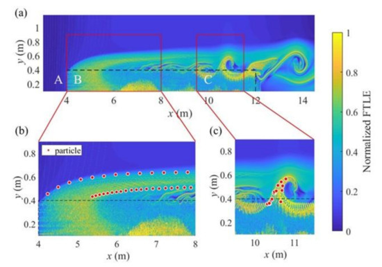 The FTLEs are normalized by their maxima as Figure 5. Figure 5b,c also compare the FTLE to particle trajectories by LPT with the Stokes number of 0.005 to avoid the significant effects of the inertia. The particles are injected as three groups: the first group of particles is placed at the zone A which has relatively lower FTLE, while the second and third particle groups are released in the zone B and C of relatively higher FTLE, respectively (Figure 5a). The particles in the first group flow downstream along the boundary of the FTLE, and stay within the mainstream zone but away from the vegetated zone (Figure 5b). The particles of the second group, placed inside of the vegetated area, are spit out from the vegetated area and flow along the yellow line boundary or ridge of an FTLE toward downstream (Figure 5b). The particles of third group, released far downstream, flow initially following the left limb of the wavy vortex getting away from the vegetated area but move back into the vegetated area following the right limb of the wavy vortex (Figure 5c). Since the LCSs and particle trajectories are pretty much identical, the flow topology visualized by LCS can predict movement well.