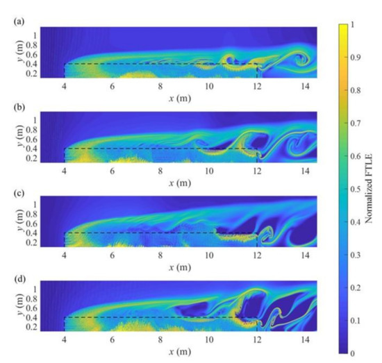 The LCS approach is a methodology that can capture the emergent patterns of flows and also can be used to understand the trapping mechanism of the particles without direct calculation for tracing them. The LCS have been used to describe the hydrodynamic structure of flows resulting from the numerical simulation [24,25,33] and the laboratory experiments [34,35]. When the LCSs are compared with sediment particle behaviors and trajectories, they are related to the transport and dispersion pattern of small particles [25].