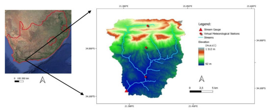 Daily rainfall as well as maximum and minimum temperatures were obtained from a nearby weather station of the South African Weather Service. Daily solar radiation, relative humidity, and wind speed were obtained from the Climate Forecast System Reanalysis project [48], run by the National Center for Environmental Prediction. In order to account for the orographic rainfall effect of the mountains, three virtual weather stations were created to imitate differential rainfall distribution over the catchment. To generate daily rainfall values for each of the virtual weather stations, rainfall coefficients were calculated by dividing the mean annual precipitation of each virtual station [40] by the mean annual precipitation of the actual weather station (1959–2013). These coefficients were then used to calculate daily rainfall values for each virtual station by multiplying daily measured rainfall from the actual weather station by the coefficient for each virtual station.