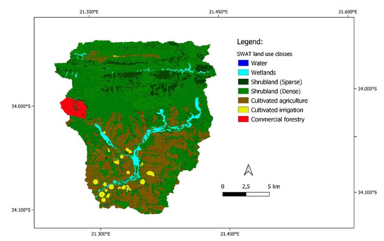Elevation of the catchment area (Figure 1) was obtained from a 30-m Shuttle Radar Topography Mission (SRTM) Digital Elevation Model (DEM) [46]. Current land use was obtained from the 2013–2014 SA National Land-Cover Map dataset [47]. Land cover was re-grouped according to SWAT land uses with pre-defined parameters for each use similar to real-world conditions (Figure 2). Table 1 provides the corresponding generic SWAT land use.