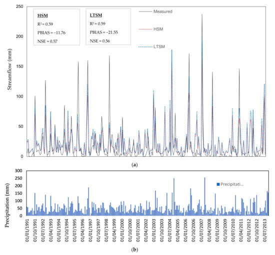 According to Knoben et al. [65], a KGE value greater than −0.41 implies that a model prediction is a better fit than the mean observed values. Therefore, it can be accepted that both uncalibrated model simulations in the current study produced satisfactory KGE values. Moriasi et al. [66] presented improved evaluation criteria for hydrologic and water-quality models. For streamflow simulations R2 > 0.6, NSE > 0.5 and PBIAS ≤ 15% were regarded as satisfactory. Although both models in the current study just fall short of the R2 > 0.6 norm, both models produced acceptable NSE values above the 0.5 threshold. The HSM model also stayed within the 15% PBIAS limit (11.76%), resulting in the HSM slightly outperforming the LTSM model. Examples of similar hydrological modelling studies obtained R2 values of anywhere between 0.15 and 0.74 [27,28,29].