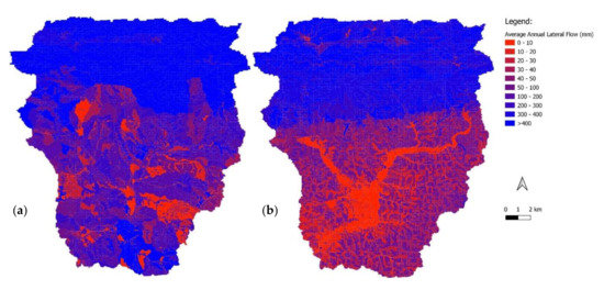 The average annual simulated lateral flow (mm·year−1) at HRU level for the (a) LTSM and (b) HSM.