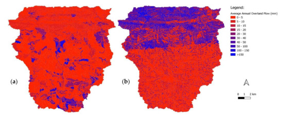 The average annual simulated overland flow (mm·year−1) at HRU level for the (a) LTSM and (b) HSM.