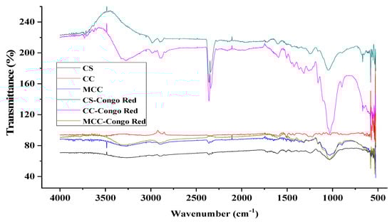 CS, CC and MCC had similar structures; a pronounced breadth pinnacle was present near 3350 cm−1 of the product, tightening the vibration of the OH−, COOH and NHx groups matching to the vibration of the functional groups in cellulose and hemicellulose []. Between 3400 and 3500 cm−1, the appearance of amines and small carbonyl overtones due to the elongation vibrations of the O-H bond were observed []. The presence of methoxy groups was also confirmed in the peak at 2904 cm−1; alkynes and carboxylic acids were found between 2000 and 2500 cm−1. The vibration observed from 1733.37 cm−1 was due to the straightening of the C=O bonds in carboxylic acids; these peaks were lighter in CC and MCC. The peaks from 1490 to 829 cm−1 were due to the stretching and bending throbbing of -CH2 as well as the -CH, -OH and C-O bonds in cellulose []. The peaks in MCC were broader and with a higher intensity, which was attributed to the modification of the structure of the material with respect to CS and CC []. After the adsorption tests, there was evidence of a band shift and the disappearance of adsorption peaks, attributed to the capture of the dye in the active adsorption centers of the bioadsorbents such as stretching at 4000–2995 cm−1 and 2900 cm−1 as well as the band expanding between 2300 and 2500 cm−1 and bending between 1635 or 1638 cm−1.