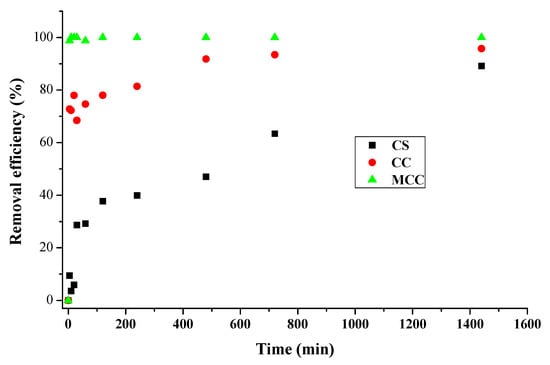 The effect of the contact time on the elimination of the CR dye was evaluated during a kinetic study to establish the saturation time and its interaction with the adsorbent []. As shown in Figure 5, CS showed a lower performance compared with CC and MCC, achieving a removal efficiency of 89% at 24 h without reaching an equilibrium and without any desorption phenomena during the contact time. Likewise, CS showed slow kinetics in the initial min, requiring a long contact time to remove and retain the biomaterial. On the other hand, CC and MCC had prompt adsorption kinetics in the beginning min of the process, reaching 78% and 99.98% removal at 120 min; an equilibrium was reached at 480 and 20 min, respectively. The fast equilibrium reached by MCC could be explained by the high disposition of active centers in the material before the experiments and the availability of RC in the water, achieving 97% removal in the first 5 min of the process [].