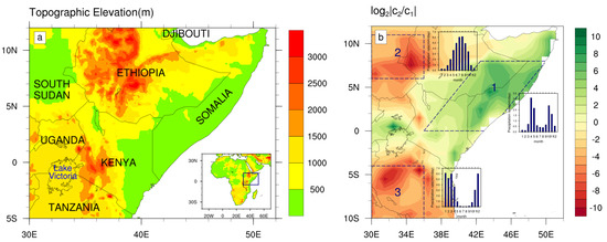 The Horn of Africa (HOA) is located on the easternmost part of the African mainland. It lies along the southern boundary of the Red Sea and extends to the Guardafui Channel, Gulf of Aden, and Indian Ocean. Diverse topographical features around the HOA (Figure 1a), including Ethiopian highlands, Eastern Great Rift, Ogaden desert, and the Somalian and Eritrean coast, influence local climate of the HOA by changing the lower atmospheric circulations and altering water vapor transport [32]. In this study, the HOA refers to the area of positive values in Figure 1b, with a significant annual cycle of bimodal precipitation (as shown in the bar plot next to box 1) mainly dominating the east of the highlands over an approximate extending range of (5° S–12° N, 30° E–52° E). Due to the various topography, the region is characterized by a semiarid climate, which is significantly different from the humid and rainy climate of other tropical regions. The Horn’s arid lowlands are particularly dry because it is under high temperature and receives lower rainfall. It is absolutely accepted that the environment of this region is very sensitive to dry/wet climate changes [33].