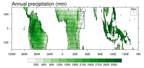 The HOA is located in the tropical region. Based on the T2m dataset of ERA5, the characteristics of temperature in the HOA were analyzed. The local annual mean temperature of the HOA is around 25.05 ℃, with a maximum temperature of 26.28 ℃ in February and a minimum temperature of 24.08 ℃ in June. However, comparing with other tropical regions, the uniqueness of precipitation in HOA with significant spatial heterogeneity in its climate characteristics can be seen from Figure 2. Most of the HOA is almost the only semiarid region in the deep tropics with annual precipitation less than 600 mm, while generally tropical regions are characterized by wet and rainy with more than 2000 mm of annual precipitation. Similar to South America at the same latitude, the heaviest precipitation occurs in April, however, the HOA has a precipitation minimum at all longitudes of tropical land. There are several factors contributing to its semiarid climatological characteristics, such as substantial topographic variations, larger-scale flow, and low-level atmospheric circulation and vapor transport [49].