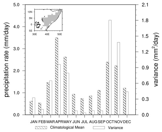 According to the positive values in Figure 1b, bimodal precipitation areas were highlighted as gray shading in the mini panel of Figure 3. Hereafter, the term “HOA” refers to the area shaded in gray in Figure 3. The bar chart with diagonal lines shows the GPCC precipitation climatological annual cycle over the HOA, and the blank bar chart is the variance (Figure 3). It indicates that the heaviest rainfall amounts occur during long rains and short rains. While the variances of short rains (especially from October to November) are greater than those of long rains, this indicates that the interannual change of precipitation depends mainly on the variation of short rains. Previous researches have discussed that short rains show a close relationship with tropical sea surface temperature anomalies (SSTAs), such as typical ENSO and Indian Ocean dipole (IOD) [51,52,53]. The stronger teleconnection between interannual variability of short rains and long-scale SST forcing helps us understand and predict OND precipitation of HOA better. However, unlike short rains, long rains show barely any correlation with SSTA or any other climate anomalies on interannual and seasonal timescales [54,55]. Therefore, it is hard to predict forecast precipitation in long rains of the HOA.