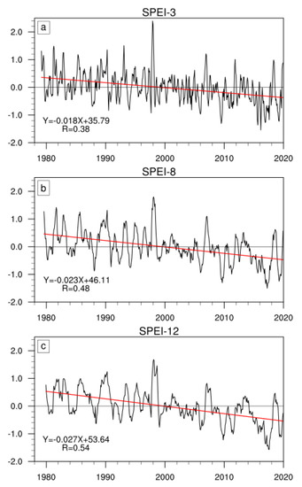 Temporal variation and trend analysis (red line) of SPEI in the HOA at each 3-month (a), 8-month (b), and 12-month (c) timescale from 1979–2019.