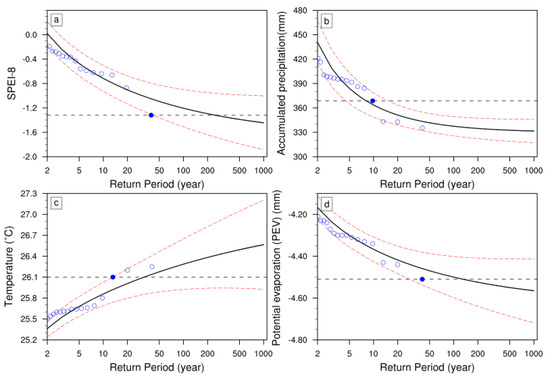 Return periods and 95% confidence intervals for SPEI-8 (a), accumulated precipitation (b), average temperature (c), and PEV (d), where the blue-filled dots represent the period from OND 2016 to MAM 2017.