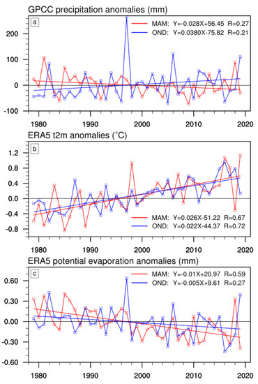 Seasonal temporal variation and trend analysis (solid lines) of precipitation anomalies (a), temperature anomalies (b), and PEV anomalies (c) during MAM (red) and OND (blue).