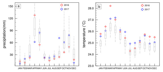 The box-and-whisker plots of precipitation (a) and temperature (b) during 2016–2017. The three horizontal lines from bottom to top in the box denotes the values of lower quartile (25th), median, and upper quartile (75th) percentiles, respectively, while the whiskers represent the values of lower bound (5th) and upper bound (95th) percentiles.