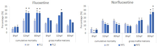 Cumulative mortality and rates of gross malformations recorded in embryos and larvae of zebrafish exposed to 0.0015 and 0.05 μM fluoxetine (FL1 and FL2, respectively) (left graph) or 0.00006 and 0.0014 μM norfluoxetine (NF1 and NF2, respectively). Results are expressed as mean ± SE. * indicates statistically significant differences in relation to the solvent control (ctr) (p < 0.05).