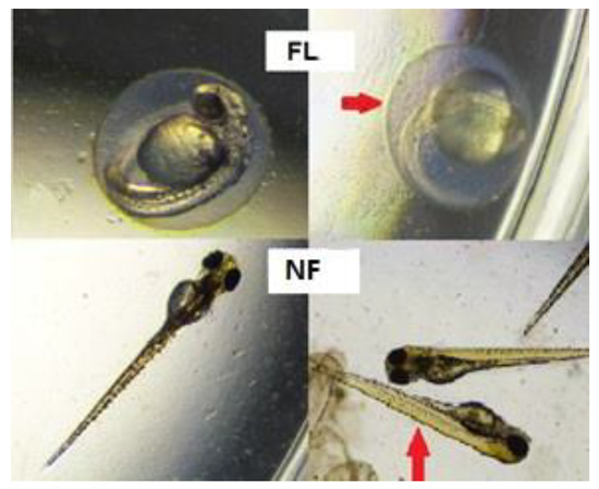Illustrative examples of pigmentation anomalies found at 32 hpf for FL (fluoxetine) and at 80 hpf for NF (norfluoxetine). Control embryos and larvae are shown in the left images; exposed embryos and larvae showing pigmentation anomalies (red arrows) are shown in the right.