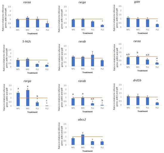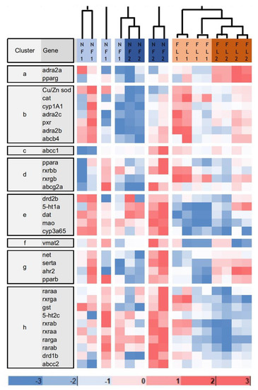 Cluster h was composed of genes raraa, rxrga, gst, 5-ht2c, rxrab, rxraa, rarga, rarab, drd1b and abcc2. Of these, rarga, rarab and rxraa were the most indicative genes, characterising the expression patterns and differences among group treatments of the whole group. Three homogeneous subsets were found for the expression of rarga, completely separating the effects of NF and FL, and the two concentrations tested for FL (Figure 3 and Figure 6). NF exposure caused upregulation of rarga expression, while FL2 elicited its downregulation at 80 hpf. For rarab, two homogeneous subsets were identified, separating the larvae exposed to NF from those exposed to FL2. NF exposure also caused upregulation of rarab expression, compared to the downregulation found in larvae exposed to FL2. For rxraa, two homogeneous subsets were found, also pointing to upregulation of its expression, particularly in larvae exposed to NF2, compared to downregulation in larvae exposed to FL2 (Figure 4). These larvae also exhibited decreased expression compared to solvent control (Table S2, Supplementary material). Compared to solvent control larvae, both FL concentrations elicited inhibition of rarab, rarga, 5-ht2c and abcc2 expression (Figure 6, Table S2).