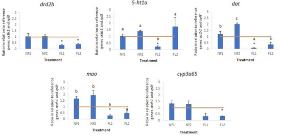 Cluster e was composed of the genes drd2b, 5-ht1a, dat, mao and cyp3a65. Of these, dat, mao and 5-ht1a were the most indicative genes, in terms of expression patterns and differences among group treatments, as indicated by the ANOVA results (p < 0.05, Table S2). Three separated homogeneous subsets were found for the expression of dat, distinguishing the effects of NF and FL, and the two concentrations tested for NF (Figure 3 and Figure 4). NF exposure caused upregulation of dat expression, which was more intense in the highest test concentration. FL exposure elicited downregulation of dat expression. The expression of mao was clearly different under the effect of NF (upregulated) and that of FL (downregulated) (Figure 3 and Figure 4). In addition, 5-ht1a expression was significantly different in FL2, compared to the remaining groups, for which clear downregulation was noted. Additionally, in larvae exposed to FL, significant differences in expression were detected for all genes (p < 0.05, compared to the solvent control, Figure 4). The most relevant changes were the decreased expression observed for 5-ht1a (~2-fold), dat (3-fold) and mao (~2-fold) in the FL1 group, relative to the solvent control.