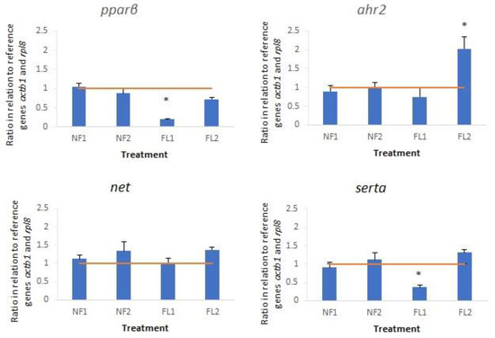 Cluster g comprised the genes net, serta, pparb and ahr2 (Figure 3 and Figure 5). Globally, the two FL concentrations had opposing effects on the expression of these genes; downregulation was found for FL1 and upregulation was observed in larvae exposed to FL2 (Figure 3 and Figure 5). No significant differences relative to the solvent control were found for these genes, in larvae exposed to NF. For FL, significant downregulation of pparb and serta (~1-fold for both genes) was found for FL1 treatment, while significant upregulation was found for ahr2 in the FL2 treatment (1-fold) (Table S2, Supplementary Material).
