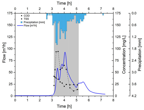 Runoff peaks are evident with maximum rainfall intensities. In this example, concentrations of COD decrease continuously throughout the sampling period regardless of flow. In contrast, TSS increases significantly at the beginning and is much more dependent on flow than COD as it progresses. Apparently, the first runoff water mobilizes solids deposited depending on flow. Furthermore, the concentration of TSS shows a rapid decrease with a simultaneous rapid decrease in flow as rainfall intensity and the discharge in the channel decreased consequently.