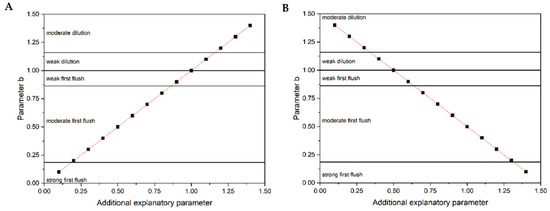 It should be noted, as shown in Figure 2A, a positive correlation of an explanatory parameter with the parameter b leads to a decreasing first flush behavior according to Table 1. In contrast, a negative correlation consequently leads to an increasing first flush behavior (see Figure 2B).